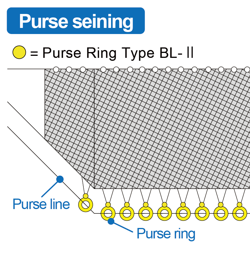 En la pesca de cerco, es posible reducir el número de herrajes metálicos al conectar las redes y las líneas de cerco. Esto permite operaciones de conexión y liberación extremadamente sencillas con un solo herraje metálico y contribuye a mejorar la eficiencia del trabajo.
