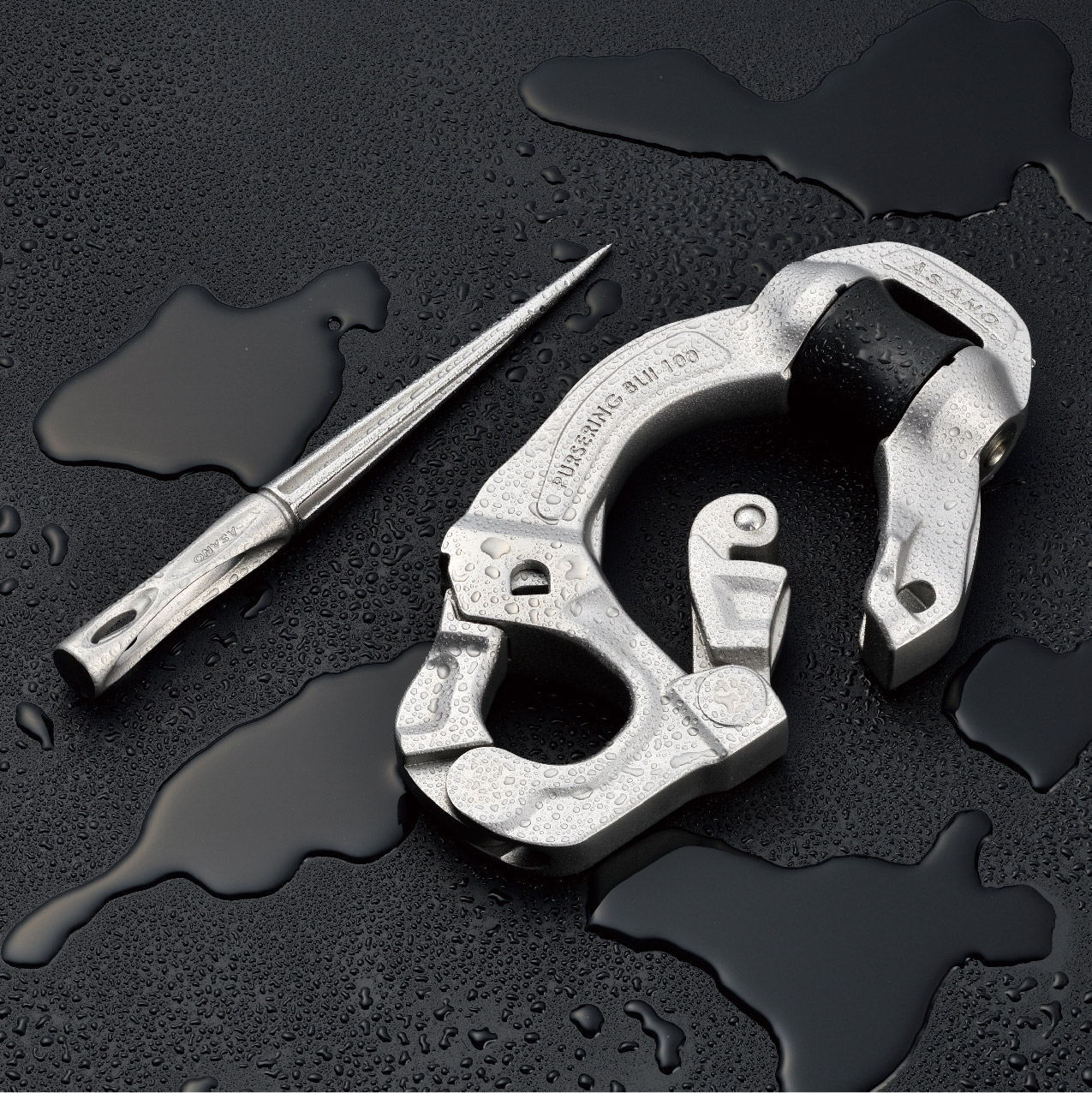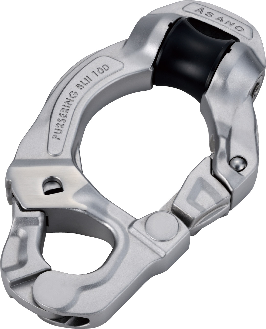 El Purse Ring Type BL-II es un modelo de nuevo desarrollo con una operatividad mejorada gracias a la incorporación de un mecanismo de apertura de doble compuerta al Purse Ring Type BL convencional (tamaño 100). Una compuerta se puede abrir en dos direcciones mediante un pincho o similar. La otra compuerta se abre con solo pulsar un botón. Esto evita que la compuerta se abra accidentalmente, garantizando así una mayor seguridad en el mar. El gancho utiliza un sistema de enclavamiento para engancharse firmemente al producto, lo que permite una mayor capacidad de carga. No solo se puede reemplazar el resorte interno de la compuerta cuando su rendimiento se deteriora debido al envejecimiento u otros factores, sino también el rodillo.
