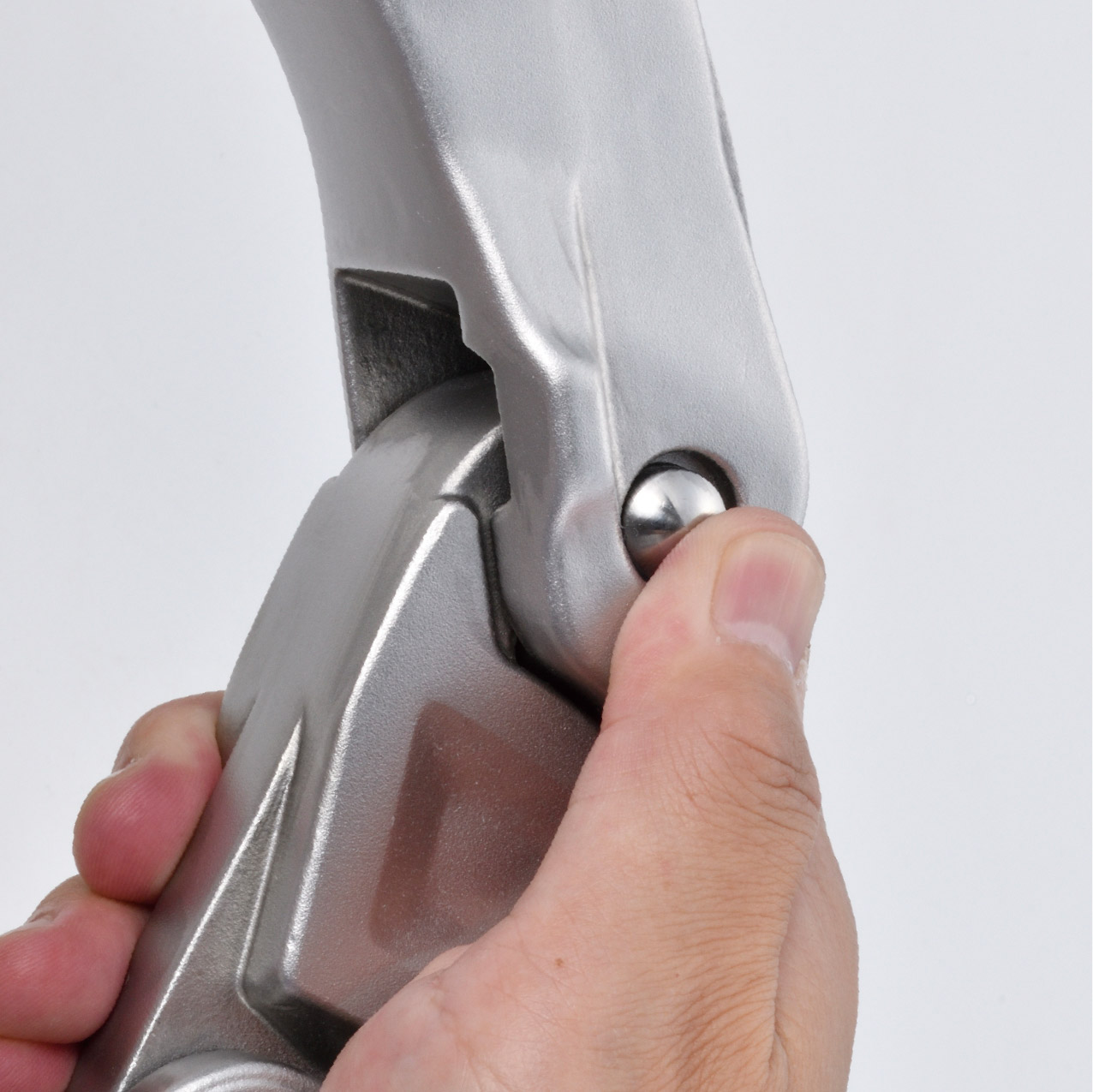 La puerta se abre presionando el botón. Se ha empleado un sistema de enclavamiento que permite que el gancho se fije firmemente al cuerpo para generar una alta carga de trabajo.