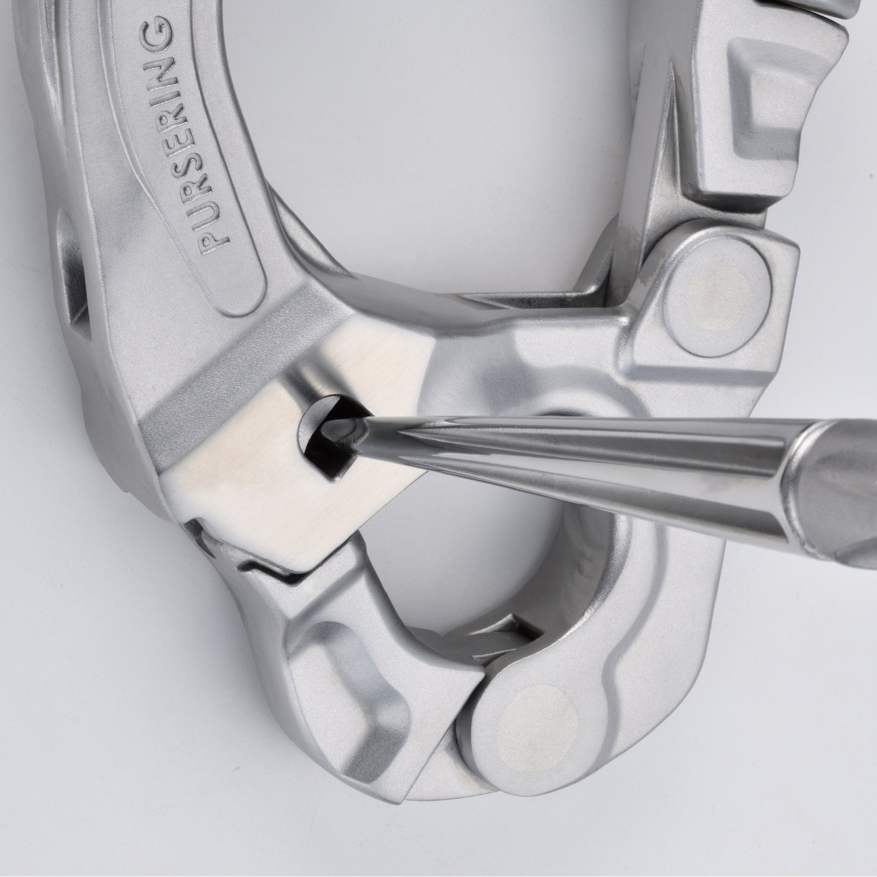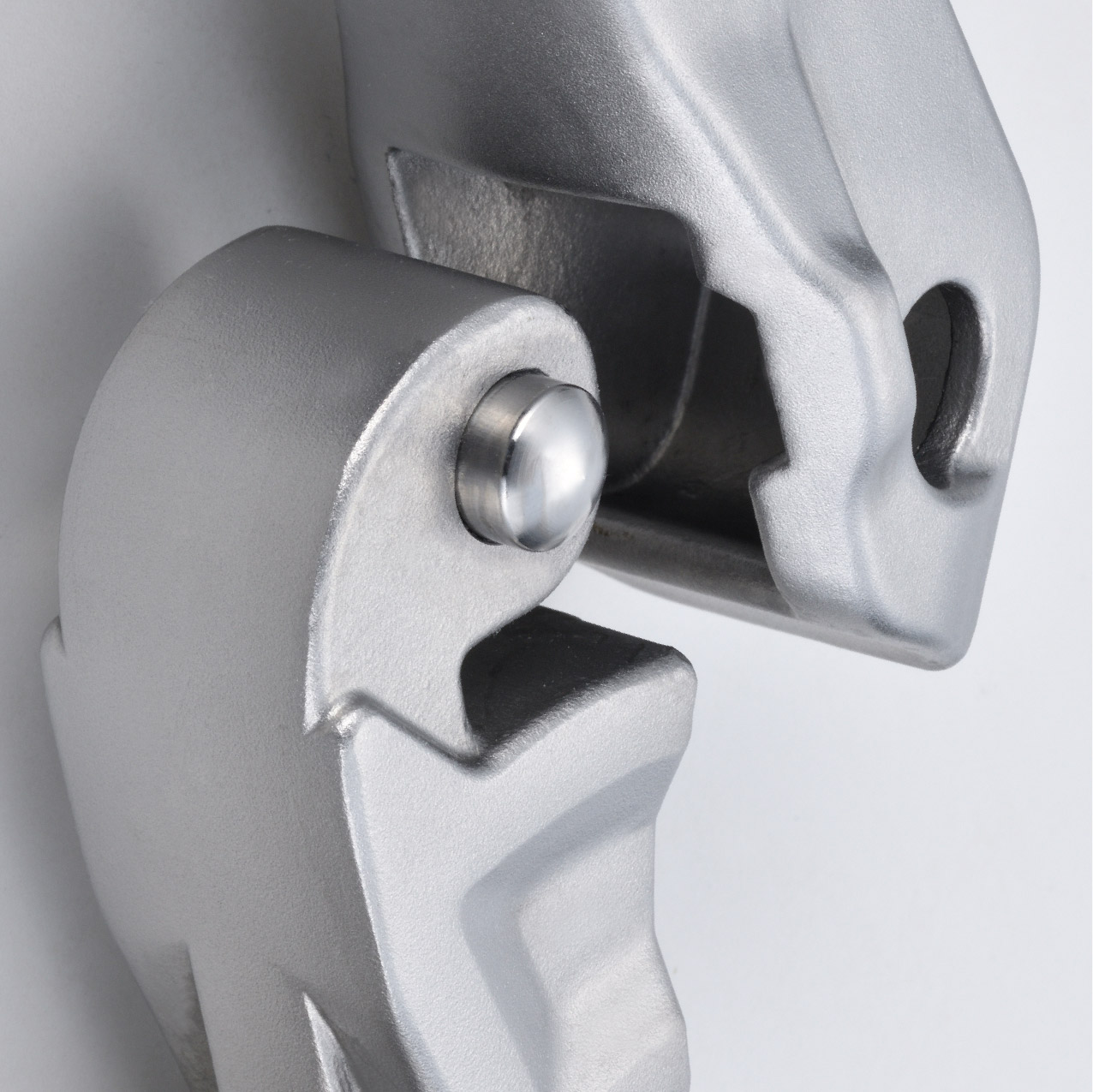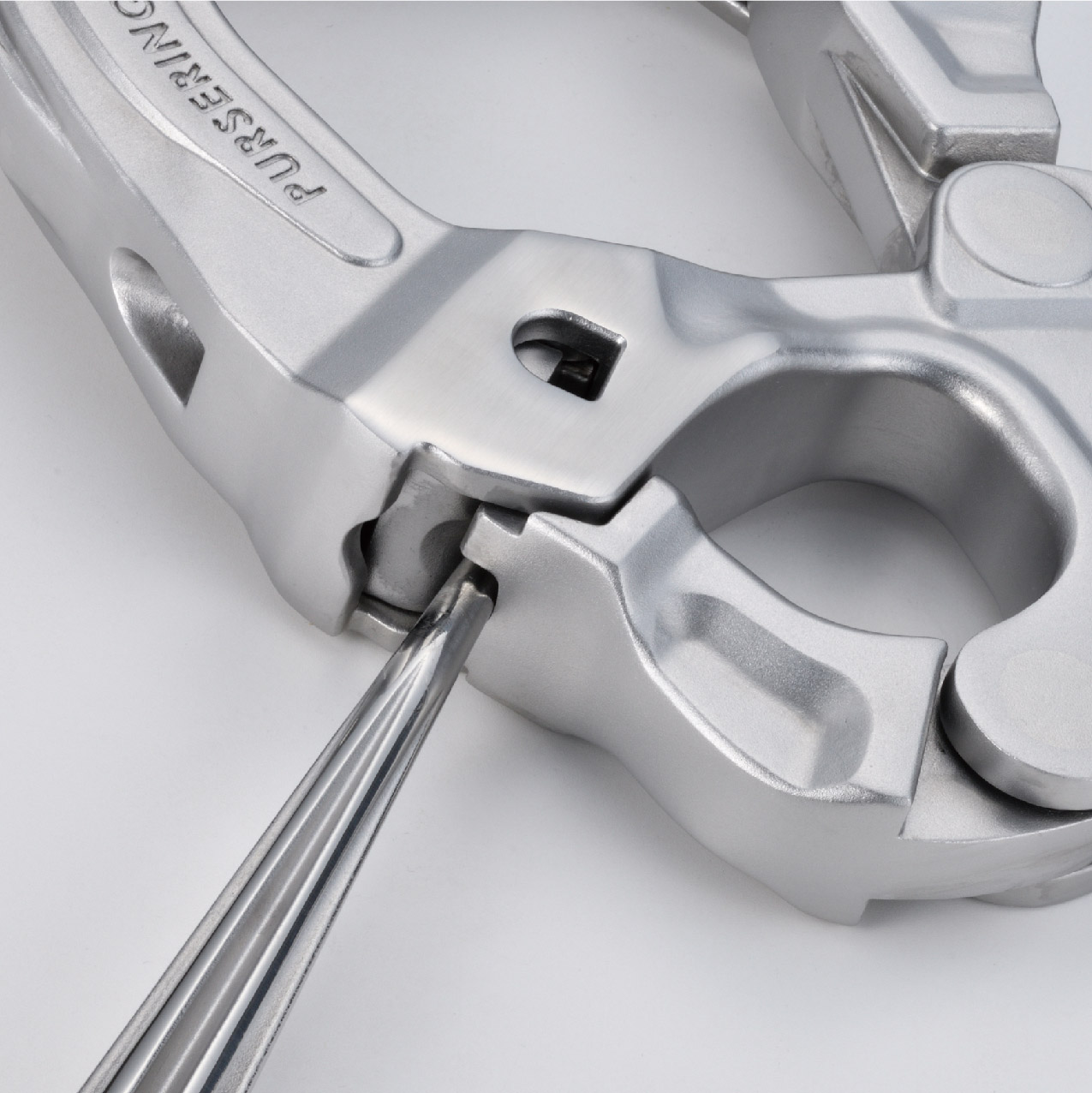 Esta anilla para bolso está equipada con un mecanismo de cierre Auto Shackle. El cierre se abre fácilmente con una herramienta como una pica marina. Está diseñada para operarse desde dos direcciones: frontal y lateral.